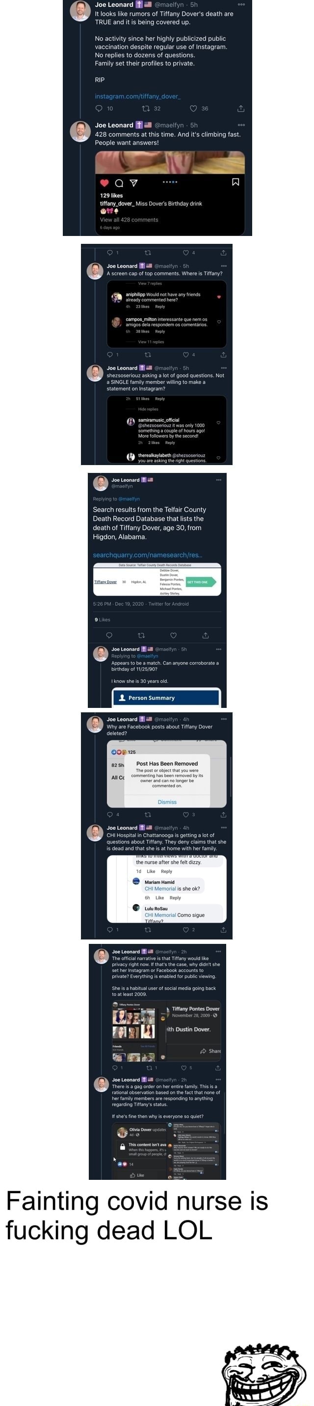 Joe Leonard It Looks Like Rumors Of Tiffany Dover S Death Are True And It Is Being Covered Up No Activity Since Her Highly Publicized Publ Iccination Despite Regular Use Of Instagram No Replies To Dozens Of Questions Family Set Their Profiles To P Rip Joe - As for now the search on searchquarry goes into error, who would have guessed, i say keep trying if you really want to check it 🙂